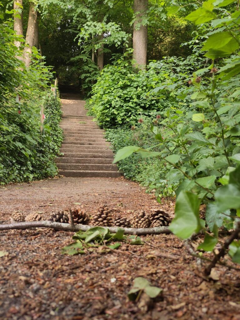 Om verticale meters te trainen is dit een ideale spot. 107 treden en als je nog hoger wil kan je nog een trap naar het restaurant bij het kopje en daarna, als het hek open is (deze keer niet) nog de uitkijktoren beklimmen. Ik hield het na twee keer die extra trap bij die ene trap, maar kon daardoor wel dennenappels verzamelen voor mijn analoge telmethode. Dennenappels voor de eenheden en takken voor de tientallen.