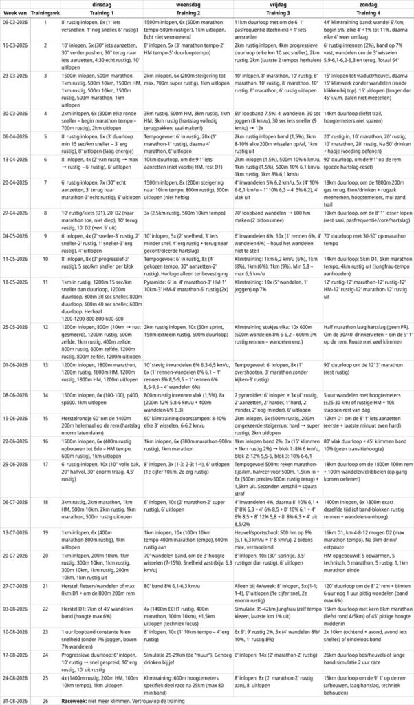 Iemand van onze loopgroep heeft een paar jaar geleden de Jungfrau marathon gelopen en had nog een trainingsschema voor mij. Ik kreeg het in delen toegeappt en uiteindelijk miste ik nog diverse trainingsweken. Met enige moeite kwamen die ook boven water en had ik een verzameling screenshots en pdf’s van het trainingsschema uit 2022. Alles in Grok geplempt en gevraagd om er een actueel trainingsschema in één spreadsheet van te maken. Dat lukte prima: